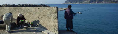 父はのべ竿の浮き釣り仕掛けを作り、母に釣らせてみるようです。で、最初に釣れたのは母親で、ホンベラでした。