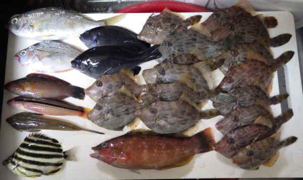 今日の釣果はカワハギ16(+リリース数匹)、ササノハベラ2、キュウセン1、メゴチ1、カゴカキダイ1、ヒイラギ1(+リリース1)、クロサギ1、メジナ2、オハグロベラ(リリース)でした。小型ながらもカワハギの引きを楽しむことができました。
