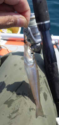 どうもキスは深い方にいそうだということで、更に移動し、8mラインまで行くと、色々な魚が魚探に写り始めました。アジも泳いでいるようです。
