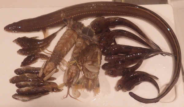 今日の釣果は、シャコ3、アナゴ1、アカハゼ4、サビハゼ4、スジハゼ5、メゴチ3でした。