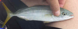 ワカシでした。それもアジより小さいようなサイズです。それでもフグ以外の魚が釣れたので、ちょっと嬉しかったですね。
