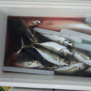 今回のアジは、写真右上の25センチサイズが中心で二人で30匹以上釣れました。小型は最も小さいもので右下の20センチサイズが10匹位、そして深場で釣った一匹と、入れ食い開始時に釣った一匹の計2匹は左の35センチサイズの大型でした。