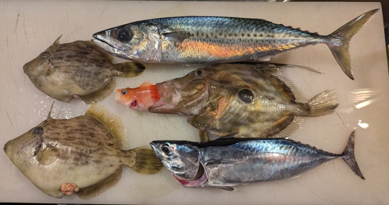 ということで、今日の私の釣果は、カワハギ2匹、マサバ1匹、マトウダイ1匹、ヒラソウダ1匹で、リリースはキタマクラ、サバフグ、エソ、ヒメ、オキトラギス、トラギスなどでした。