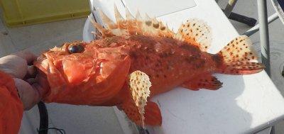 で、上がってきたのは、40センチを超える立派なサイズのオニカサゴでした。これは嬉しい釣果ですね。私としてはアカムツよりも珍しい釣果です。